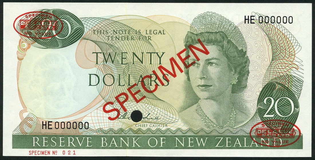 (†) Reserve Bank of New Zealand, specimen $20 (2), ND (1977), both serial number HE 000000, signature Hardie, green on multicoloured underprint, portrait of Queen Elizabeth II at right, reverse miro at left, pigeon at centre, the first overprinted SPECIMEN in red with two De La Rue specimen ovals on obverse and reverse and SPECIMEN No 021 in lower left margin, one punch hole, the second perforated SPECIMEN OF NO VALUE