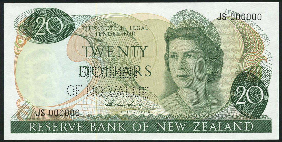 (†) Reserve Bank of New Zealand, specimen $20 (2), ND (1977), both serial number JS 000000, signature Hardie, green on multicoloured underprint, portrait of Queen Elizabeth II at right, reverse miro at left, pigeon at centre, the first overprinted SPECIMEN in red with two De La Rue specimen ovals on obverse and reverse and SPECIMEN No 021 in lower left margin, one punch hole, the second perforated SPECIMEN OF NO VALUE