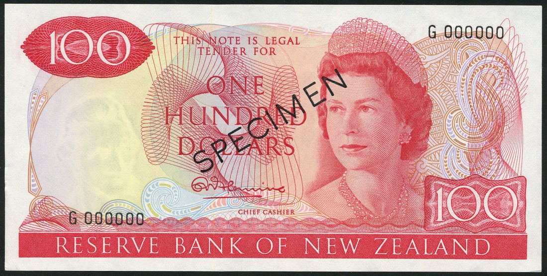 (†) Reserve Bank of New Zealand, specimen $100, ND (1967), serial number G 000000, signature Fleming, red on multicoloured underprint, portrait of Queen Elizabeth II at right, reverse mountain daisy at left, takahe at centre, overprinted SPECIMEN diagonally in black on obverse and reverse