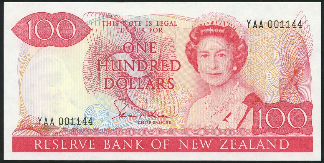 (x) Reserve Bank of New Zealand, a group of notes consisting of $1, ND (1981-85), serial number AAA 003769, $2, ND (1989-92), serial number ENW 203513, $5, ND (1989-92), serial number JJP 295060, $20, ND (1989-92), serial number TJG 625612, $100, ND (1981-85), serial number YAA 001144, $10, 1990, serial number BBB 022561