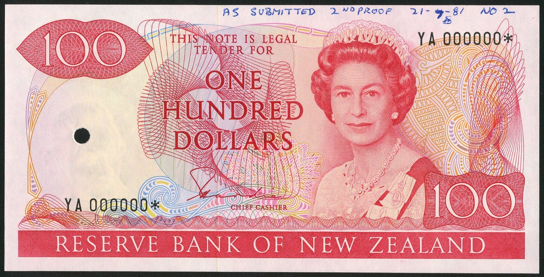 (†) Reserve Bank of New Zealand, specimen proof $100 (2), ND (1981-85), the first serial number YAA 000000, the second serial number YA 000000*, both signature Hardie, carmine-red on multicoloured underprint, mature portrait of Elizabeth II at right, reverse mountain daisy at left, takahe at centre, one punch hole