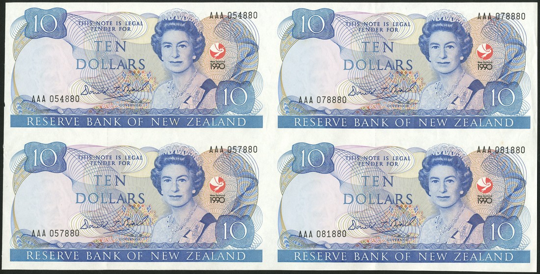 (x) Reserve Bank of New Zealand, uncut sheet of four $10 notes, 1990, blue and turquoise on multicolour underprint, Elizabeth II at right