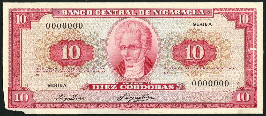 (†) Banco Central de Nicaragua, an obverse composite essay on card for a 10 Cordobas, ND (ca 1961), Serie A, black serial number 0000000, "Signature" twice at lower centre and left, red on multicoloured underprint, Miguel de Larreynaga at centre, value in large ornate guilloches on either side and in each corner