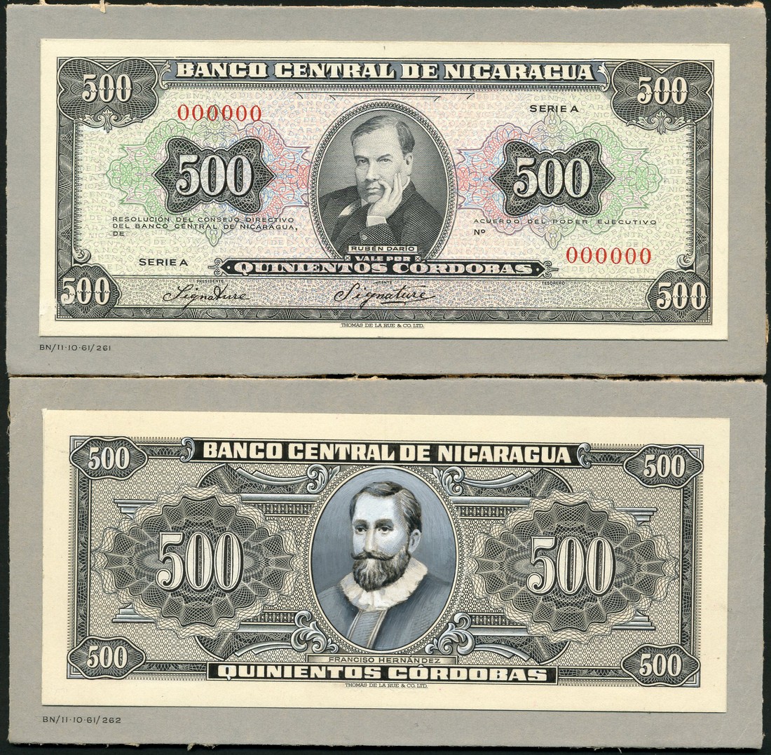 (†) Banco Central de Nicaragua, an obverse and reverse composite essay on board for a 500 Cordobas, ND (1961), Serie A, red serial number 0000000, "Signature" twice at lower centre and left, black on multicoloured underprint, Ruben Dario at centre, value in guilloches on either side and in each corner, reverse portrait of Francisco Hernandez de Cordoba at centre, value in ornate guilloches at left and right