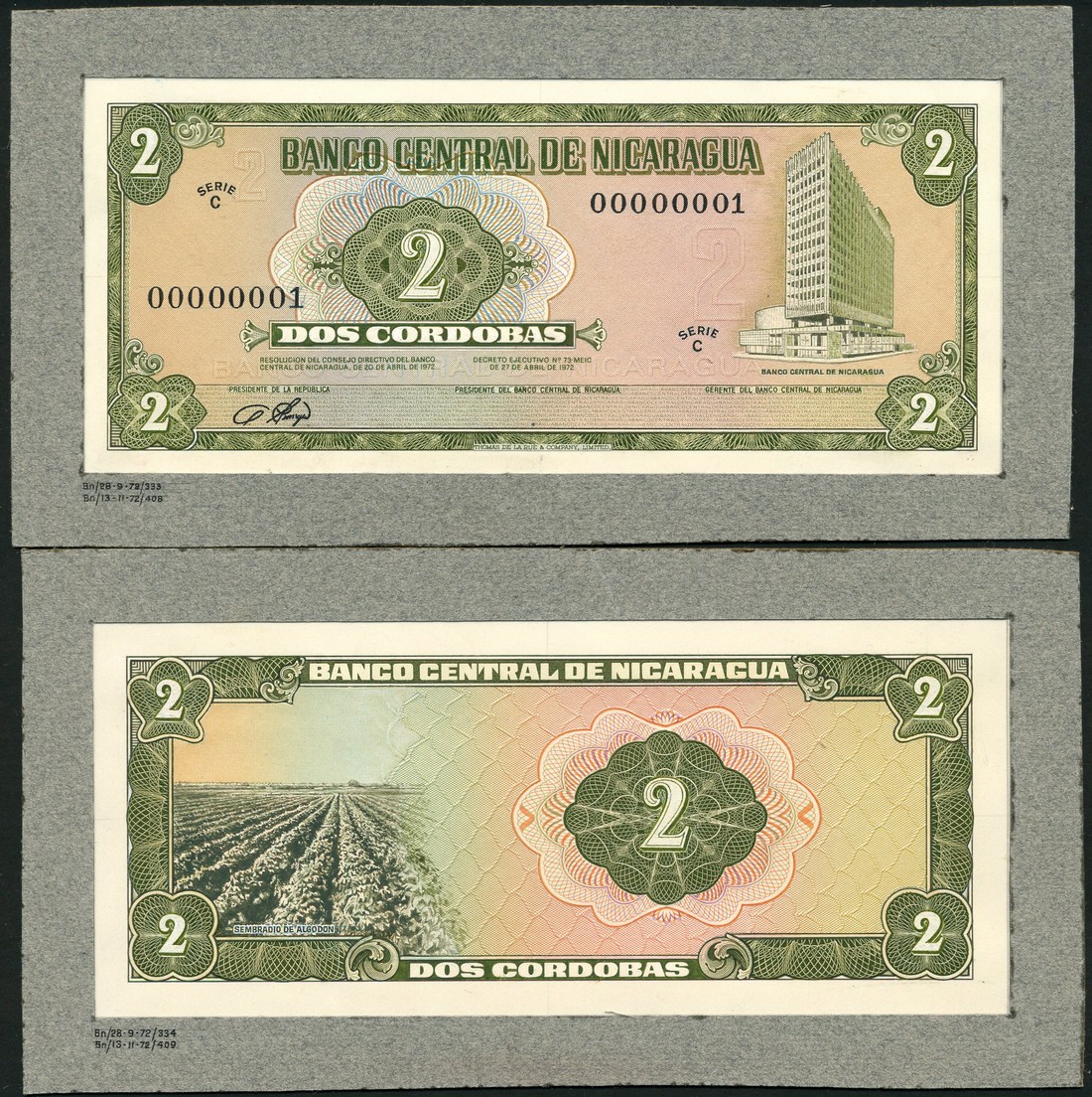 (†) Banco Central de Nicaragua, an obverse and reverse composite essay on card for a 2 Cordobas, Decreto 27 April 1972, Serie C, serial number 00000001, olive-green on multicoloured underprint, Banco Central building at right, value in ornate guilloche at centre left and in each corner, reverse cotton field at left, value in ornate guilloche at centre right and in each corner