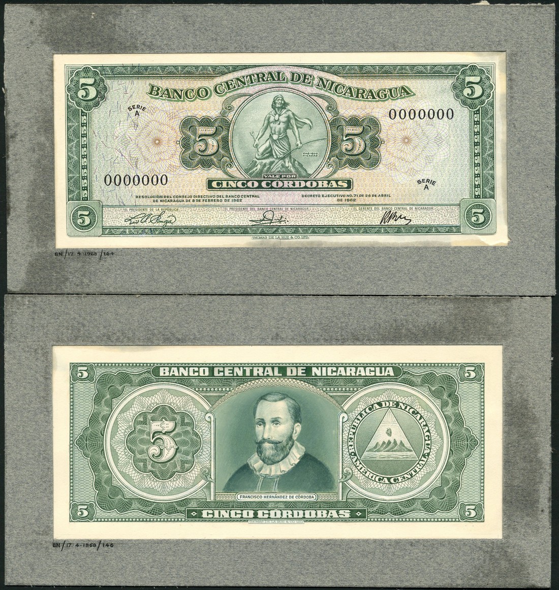 (†) Banco Central de Nicaragua, an obverse and reverse composite essay on card for a 5 Cordobas, Decreto 26 April 1962 (1968) Serie A, black serial number 0000000, 3 signatures, green on multicoloured underprint, Cacique Nicaro at centre, value in guilloches on either side and in each corner, reverse portrait of Francisco Hernandez de Cordoba at centre, value at left, arms at right