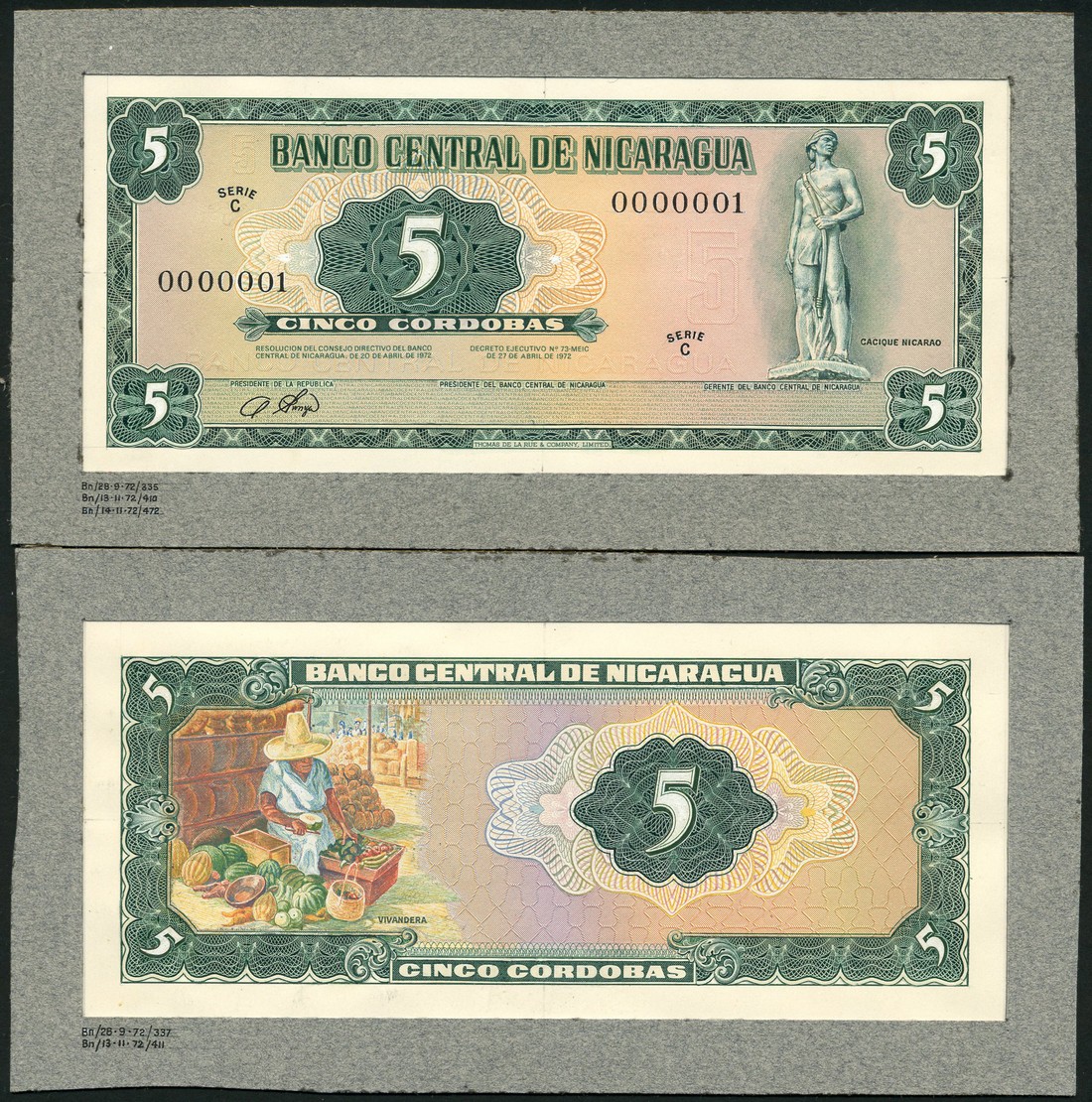 (†) Banco Central de Nicaragua, an obverse and reverse composite essay on card for a 5 Cordobas, Decreto 20 April 1972, Serie C, black serial number 0000001, 1 signature, green on multicoloured underprint, statue of Cacique Nicaro at right, value in ornate guilloche at centre left and in each corner, reverse fruit and vegetable seller at left, value in ornate guilloche at centre right