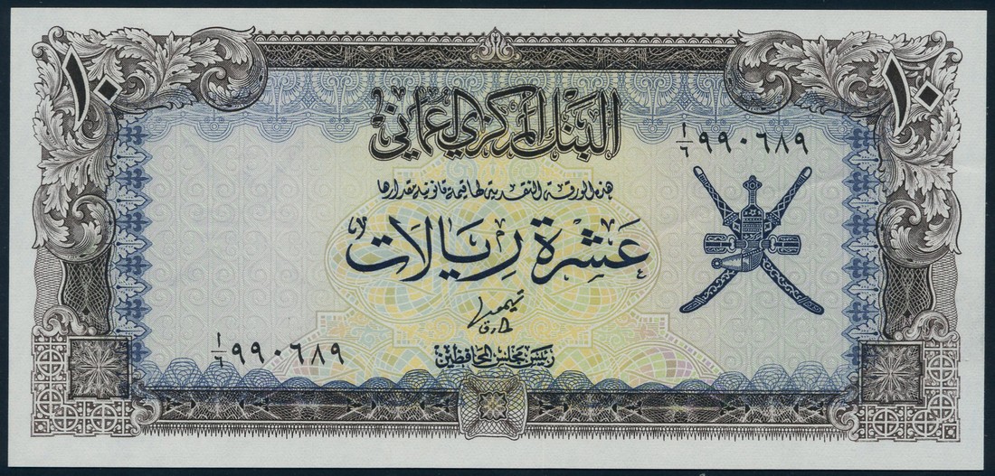 (x) Central Bank of Oman, 10 rials, ND (1977), serial number A.6 990689, brown and blue on multicolour underprint, arms at right, value at top left and right, reverse brown, coastal castle at centre