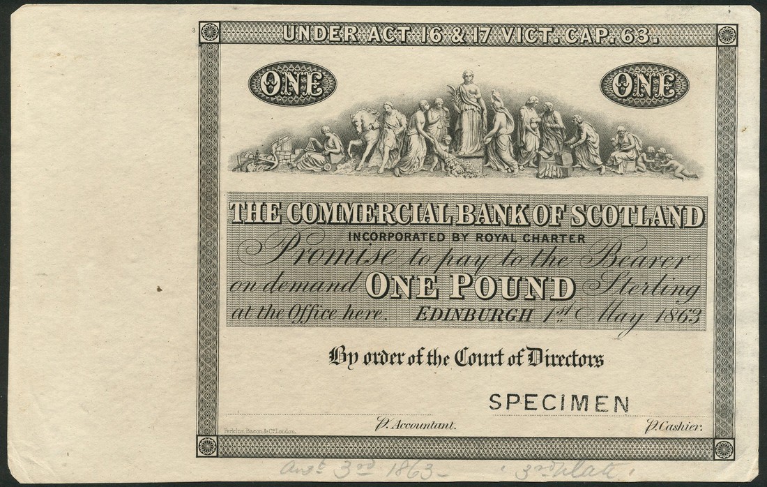 Commercial Bank of Scotland, uniface proof on paper for a £1, 1863 black and white, frieze at top centre, flanked by values, first square format with counterfoil at left