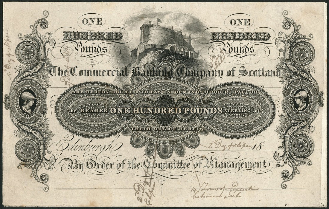 Commercial Banking Company of Scotland, a uniface proof on thick paper for £100, 18-, black and white, Edinburgh Castle at top centre, female heads (Scotland?) at left and right, value at centre and top left and right