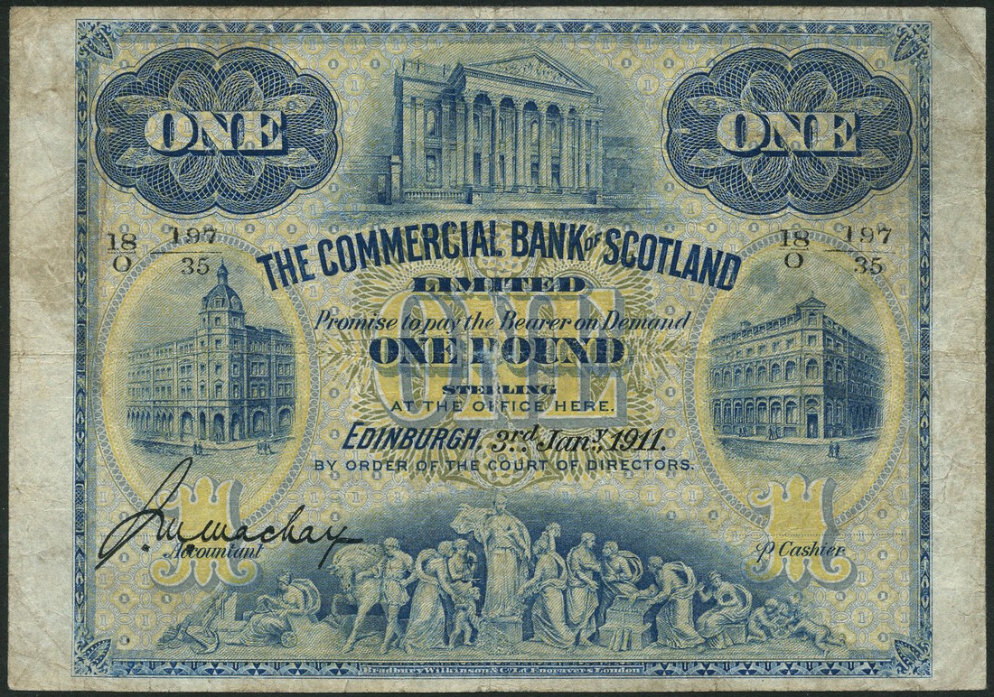 The Commercial Bank of Scotland Limited, £1, 3 January 1911, serial number 18/Q 197/35, blue on mauve and yellow underprint, frieze at low centre, bank buildings at left and right and top centre, value at centre and each corner, reverse mauve, bank emblem at centre