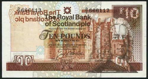 Royal Bank of Scotland plc, £10 with major printing error, 23 March 1994, serial number D/2 666113, brown on multicolour underprint, reverse printing showing through completely on obverse, Lord Ilay at right with reverse of Glamis Castle underneath