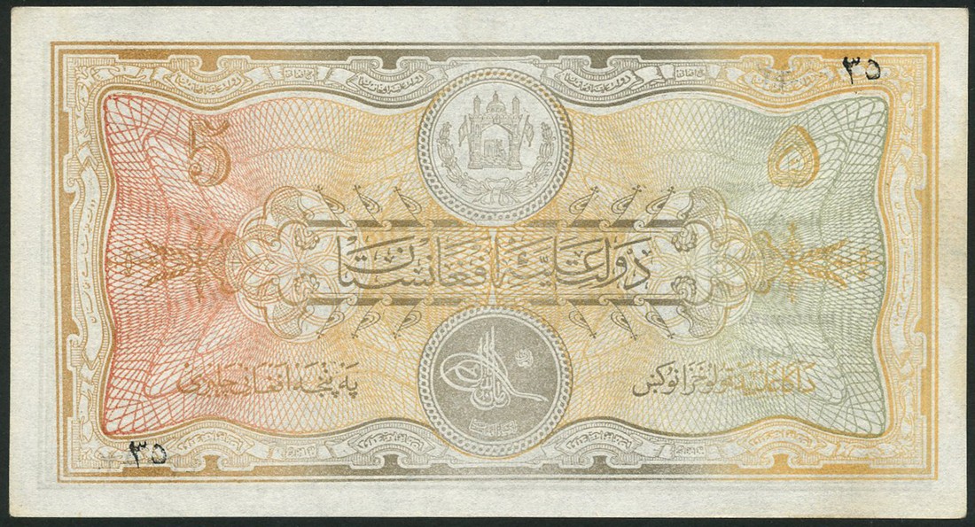 Afghan Treasury, a small group comprising 5 afghanis, 1926, yellow and olive green, 10 afghanis, 1926, brown and green, 50 afghanis, 1928, red and green, with lattice watermark pattern and handstamps
