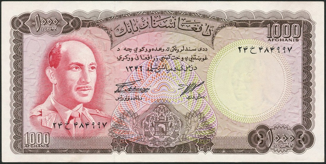 The Afghanistan Bank, a full set of the 1967 issue, comprising 50 afghanis, green, 100 afghanis, burgundy, 500 afghanis, blue and 1000 afghanis, brown