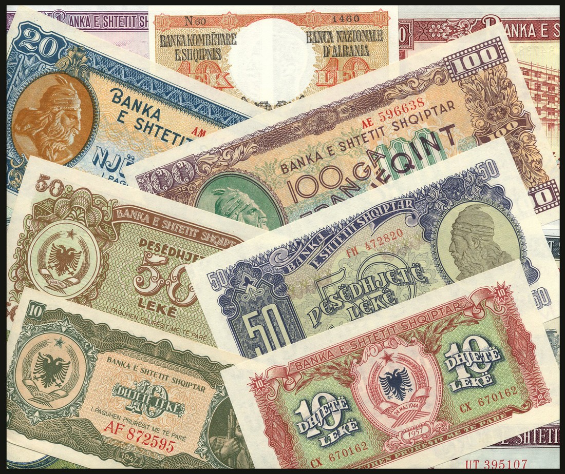 Albania, a sizable group of notes including 1000 leke, 1949, serial number TH 209395, purple on green and blue underprint, also 5 and 20 franga, 1939, and 100 franga 1945, and many later issues