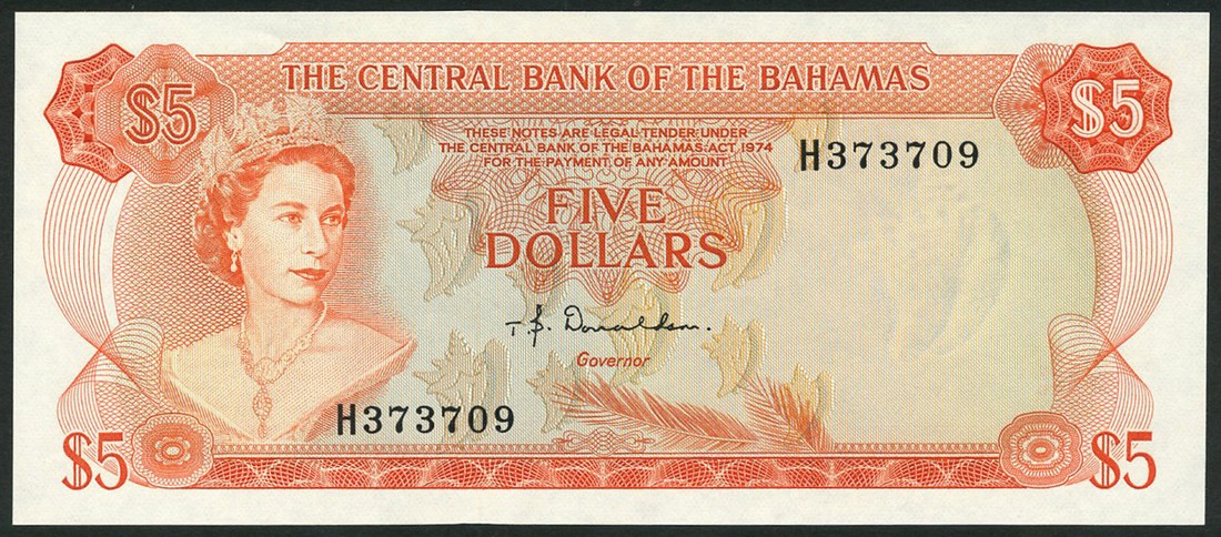 The Central Bank of the Bahamas, a pair of notes of the 1974 Issue, $1 serial number F/1 376965, signature Donaldson, green on multicoloured underprint, $5 serial number H 376965, signature Donaldson, orange on multicoloured underprint