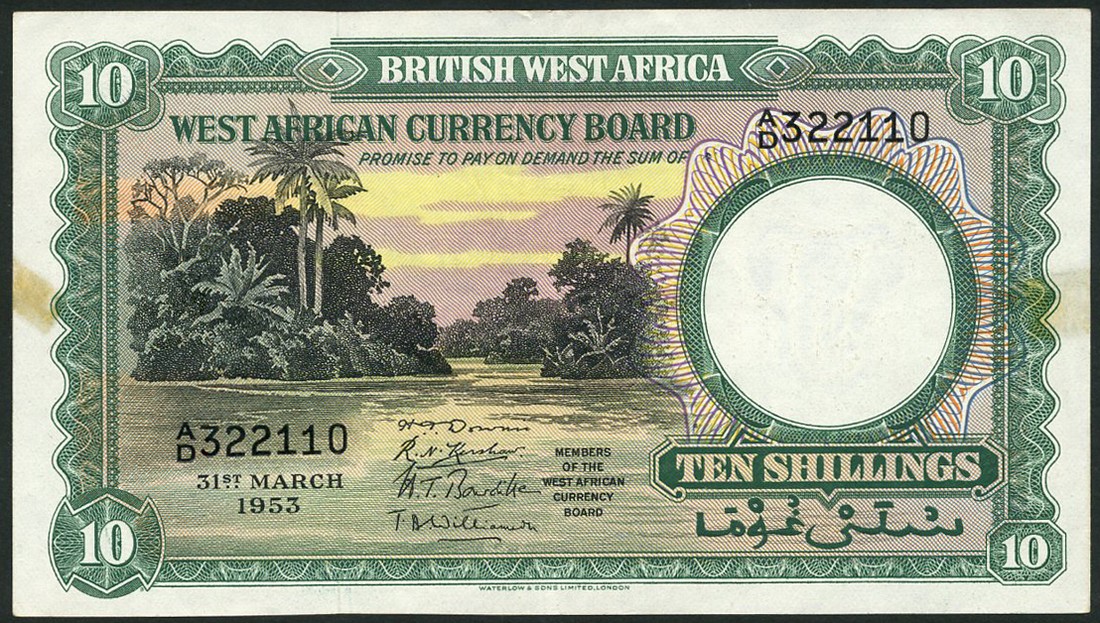 West African Currency Board, 10/-, 31 March 1953, serial number A/D 322110, green on multicolour underprint, river and trees at left, also 20/-, 1 December 1942, black and orange, palm tree at centre