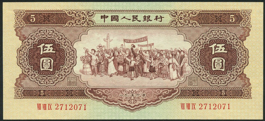 People's Bank of China, 1 yuan, grey and 5 yuan, brown, both 1956
