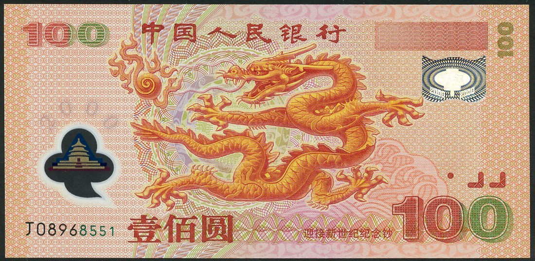 Bank of China, 50 yuan commemorative issue, 1999, red and multicoloured, Chairman Mao giving speech at right, 100 yuan, 2000 yuan commemorative issue, red and multicoloured, dragon at centre, a polymer note