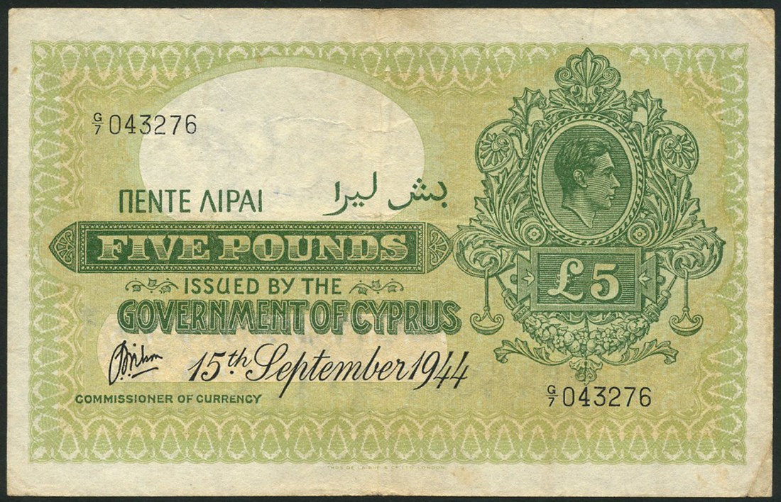 Government of Cyprus, £5, 15 September 1944, serial number G/7 043276, green on bright green underprint, George VI at top right, also 1/-, 1942, 5/-, 1950 and £1 1943, and 3 piastres, 1944