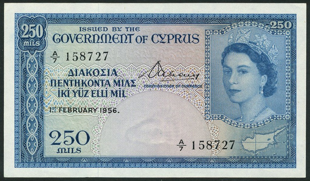 Government of Cyprus, 250 mils, 1 February 1956, serial number A/7 158727, blue on multicolour underprint, Elizabeth II at right, map of Cyprus below, also £1, 1955, brown