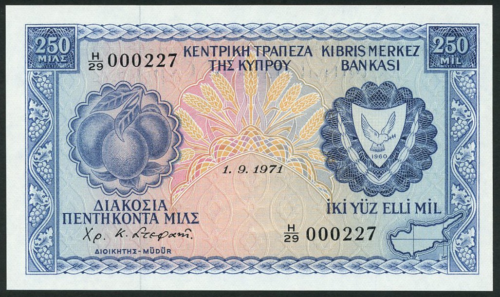 Central Bank of Cyprus, 250 mils, 1 September 1971, serial number H/29 000227, blue on multicolour underprint, grapes on vine at left, arms at right, reverse blue, mining scene