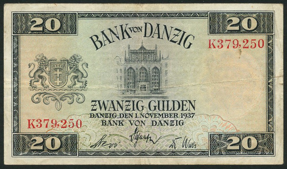 Bank von Danzig, 20 gulden, 1 November 1937, serial number K379,250, black on multicolour underprint, courtyard at centre, arms at left, value at each corner