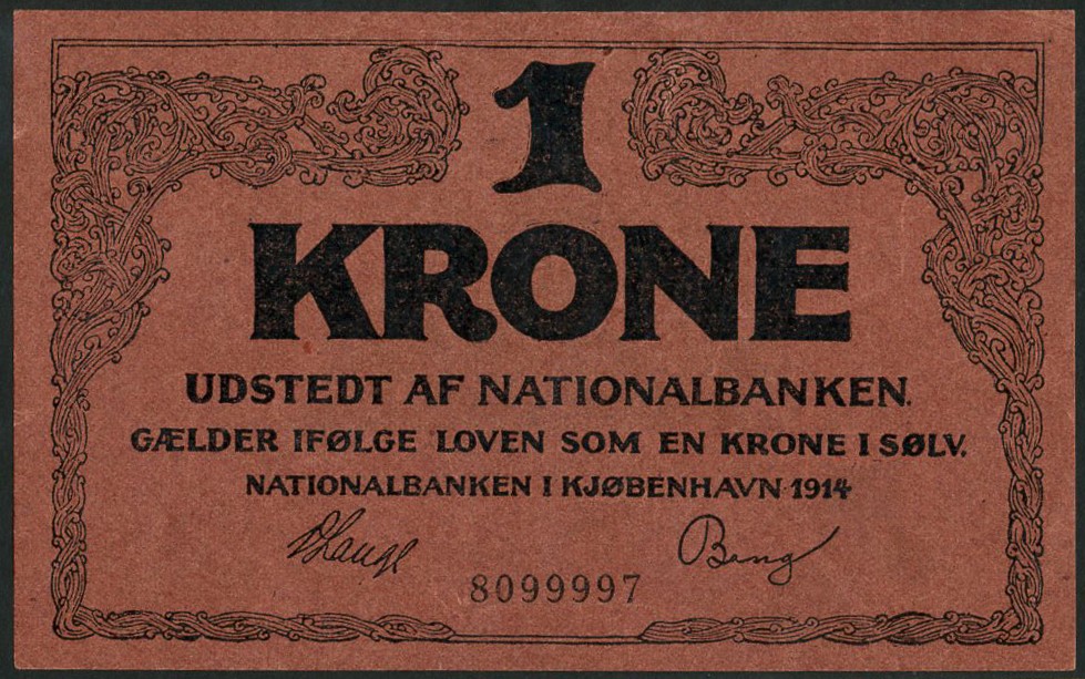 Danish National Bank, 1 krone (2), 1914, serial numbers 001678 and 8099997, black on red paper, each reverse with different coat of arms, also 1 krone, 1921, serial number 2N9671453, purple and cyan, and 10 kroner, 1928, serial number O2945579, brown and tan
