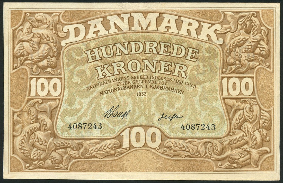 Danish National Bank, 100 kroner, 1932, serial number 4087243, brown on tan and green underprint, values with dolphins in borders, reverse arms flanked by mer-men