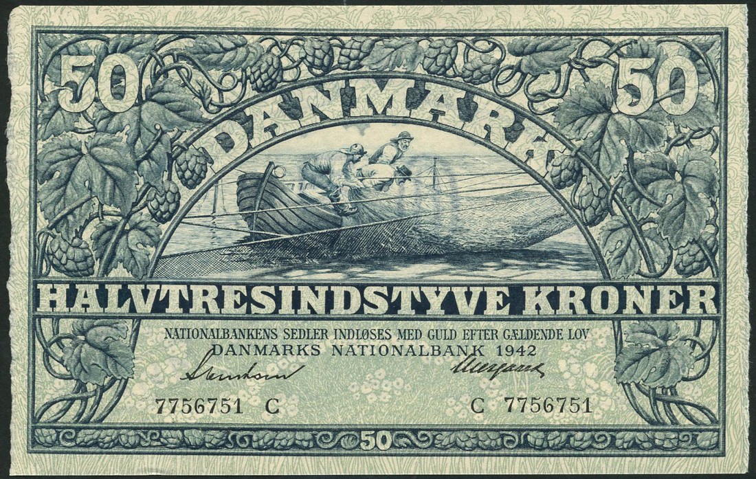 Danish National Bank, 5, kroner, 1943, blue, 10 kroner, 1943, brown, 50 kroner, 1942, blue, and 100 kroner, 1943, brown, all with ornate scrollwork of plants and animals, the 5 with landscape and prehistoric burial, the 50 with fisherman and boats