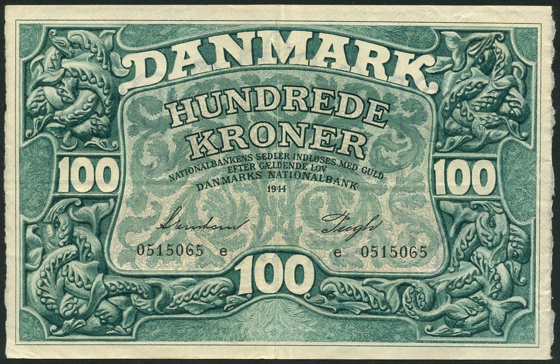 Danish National Bank, 10 kroner, 1944, brown, 10 kroner, grey-green, and 100 kroner (2), green and grey-green, ornate borders with scrollwork, seaweed and dolphins