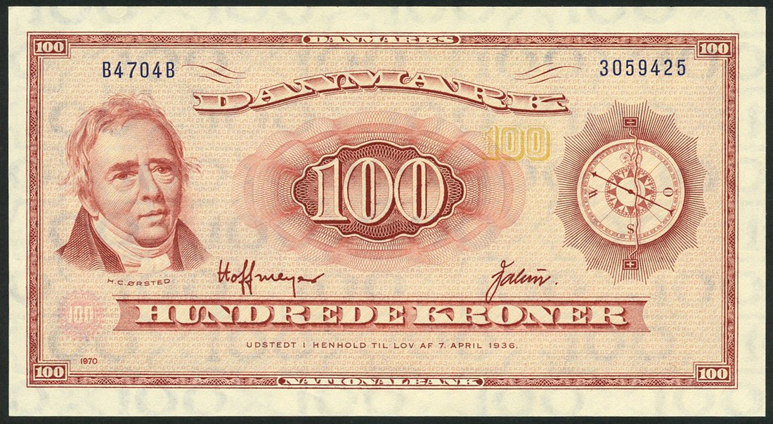 Danish National Bank, 10 kroner, 1951, serial number A4511H 1981480, black and olive brown, also 5, 10, 50 and 100 kroner, 1950-63 issue