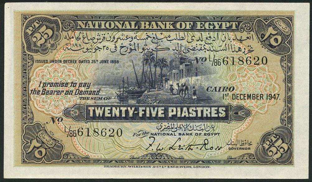 National Bank of Egypt, 25 piastres, 1 December 1947, serial number L/86 61860, dark purple on multicolour underprint, river scene with camel and boats at centre