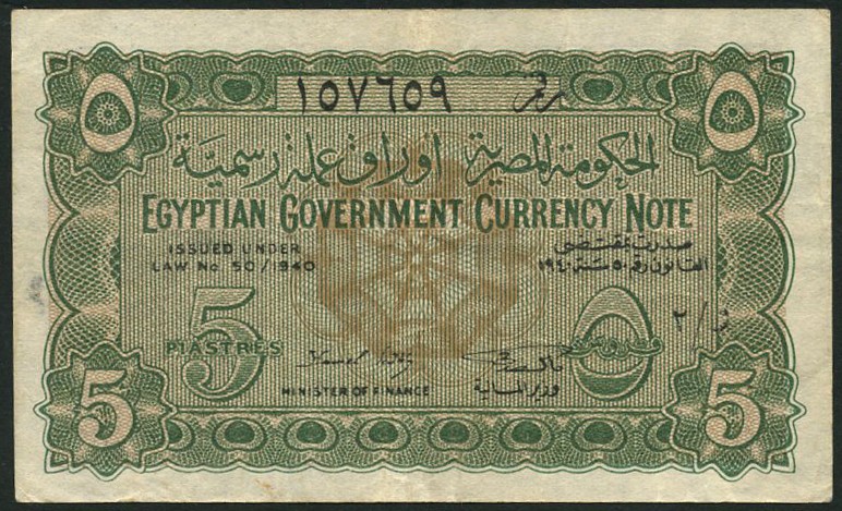 Egyptian Government, 5 piastres, ND (1940), serial number 157659, green and olive-brown, value at left and right and each corner, reverse purple, Aswan Dam, also 10 piastres, 1917
