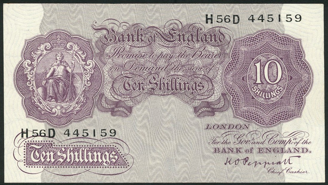 Bank of England, K.O.Peppiatt, 10/-, ND (1940), prefix H56D, and £1, ND (1940), prefix H85E, first purple, second blue and pink, Britannia at top left, value at top right