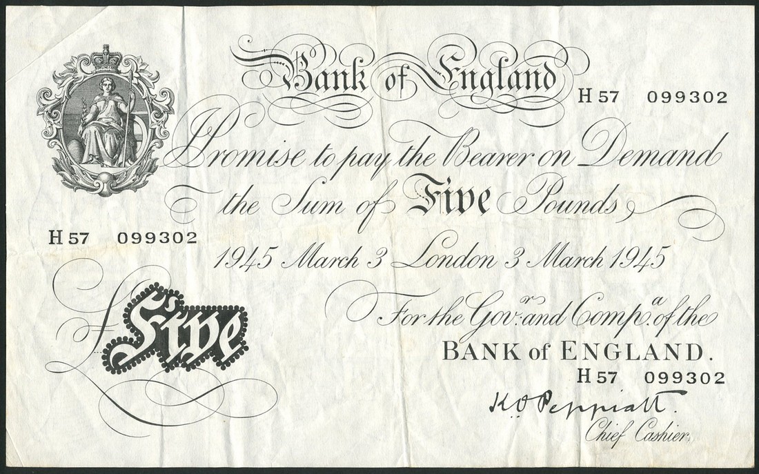 Bank of England, K.O.Peppiatt, £5, 3 March 1945, serial number H57 099302, also a Bernhard forgery, £5, 15 August 1938, serial number B/264 15813, both black and white, ornate crowned vignette of Britannia at top left, value in black tablet at low left