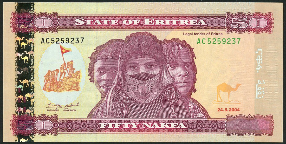 State of Eritrea, 1, 5, 10 and 20 nakfa, 1997, and 50 nakfa, 2004, all with three women or children at centre