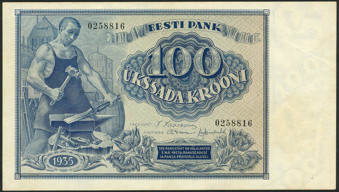 Bank of Estonia, 5 krooni, red, 20 krooni, green, 50 krooni, brown, and 100 krooni, blue, 1928-35 issue, and 10 krooni, 1937, blue all with values at right, fisherman, farmers, blacksmith and coastal scenes at left