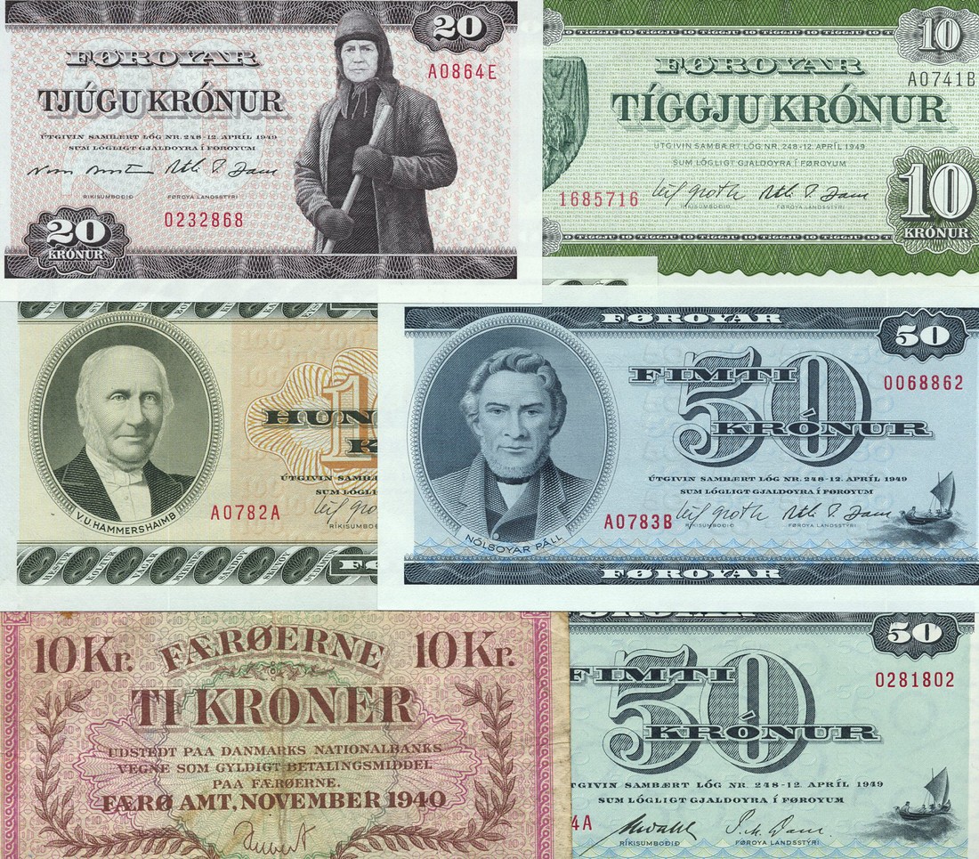 Foroyar, Danish Administration, 50 and 100 kronur, 1964-74, black/green and yellow/pink respectively, also 20, 50 and 100 kronur, 1978-86, 50, 100 and 200 kronur, 2001-2005, 10 kronur, L.1949, and 10 kronur, 1940