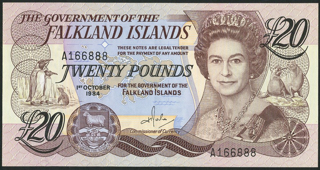 Government of the Falkland Islands, £1, 1984, blue, £5, 1983, red, £10, 1986, green, and £20, 1984, brown, all with Elizabeth II at right, arms at low left, penguins at left, sealions at right, also £5, 2005, red
