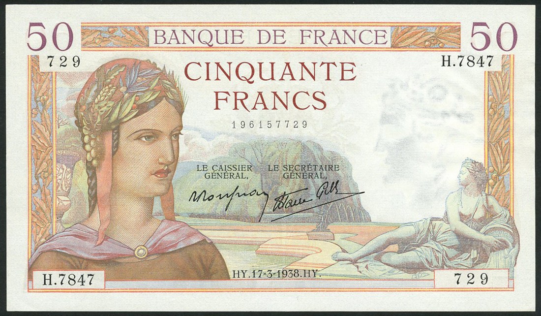 Banque de France, 50 francs, 17 March 1938, serial number H.7847 729, multicolour, Ceres at left, reverse Mercury at right