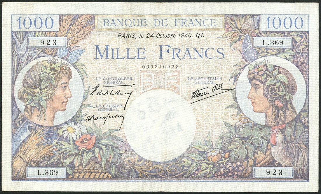 Banque de France, 20, 50, 100, 500 and 1000 francs, 1940-41, multicoloured, all with male and female allegories and French architecture and landscapes on obverse and reverse
