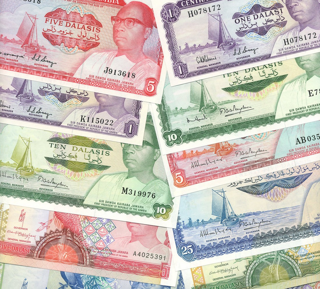 The Gambia Currency Board, 10/-, ND (1965-70), serial number B635966, green, and £1, ND (1965-70), serial number C264991, green, both with boat at left, 1, 5 and 10 dalasi, ND (1971-87), 1, 5, 10 and 25 dalasi, ND (1978), 5, 10, 25 and 50 dalasi, ND (1989-91), all with President D. Kairaba at right, also several later issues