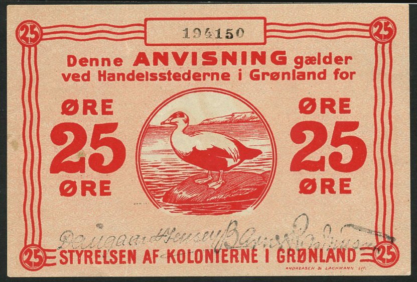 Greenland, State Notes, 25 ore, ND (1913), serial number 194150, red on pale pink underprint, Eider Duck at centre, large Rasmussen signature, also 5 and 10 kroner, ND (1953-67), serial numbers 0651719 and 0880052, green and brown respectively, Polar Bear and Whale at centre