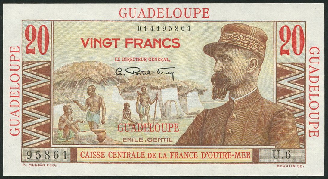 Caisse Centrale de la France d'Outre-Mer, Guadeloupe, 20 francs, ND (1947-49), serial number U.6 95861, multicolour, Emile Gentil at right, village scene at centre left, also 10 francs, 2 February 1944, purple and red, Marianne at centre and Banque de Guadeloupe, 25 francs, ND (1934, 1944), woman with wreath at centre, also Martinique, a small selection