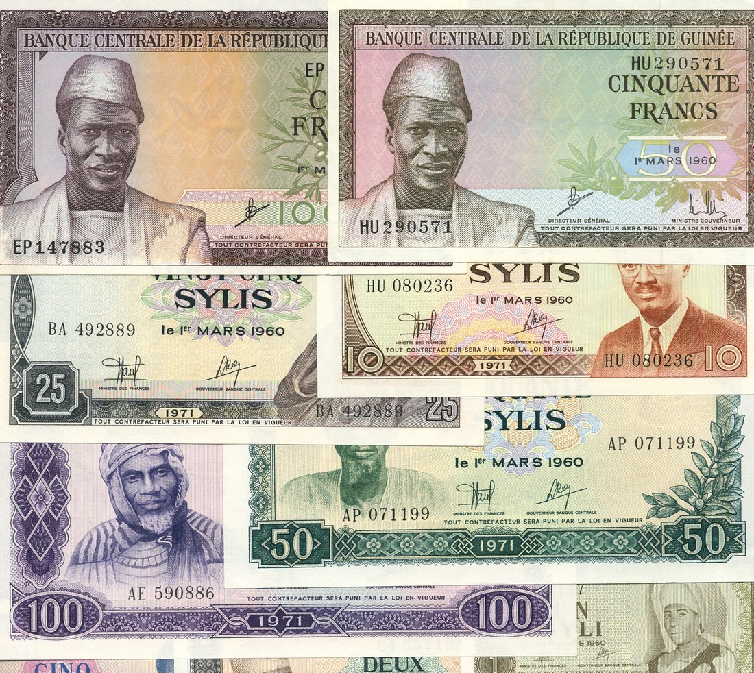 Banque Centrale de la Republique de Guinee, a group including 50, 100 and 1000 francs, 1 March 1960, all with President Sekou Toure at left, also a selection of more modern issues
