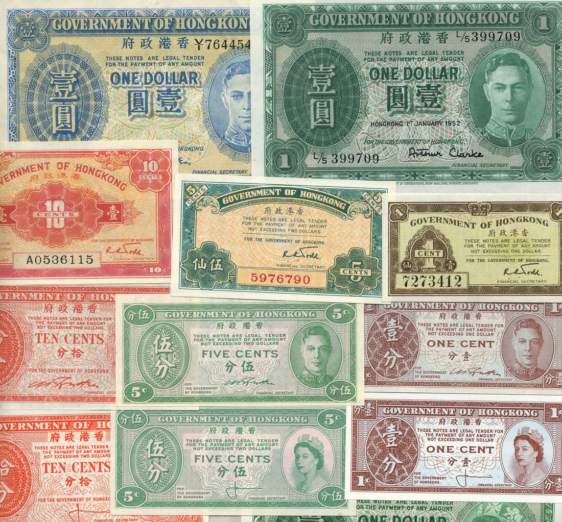 Government of Hong Kong, a small group including $1, ND (1936), serial number M791887, purple on multicolour underprint, George VI at right, also $1, ND (1940-1), blue and $1, green, 1 January 1952, and a selection of lower denominations
