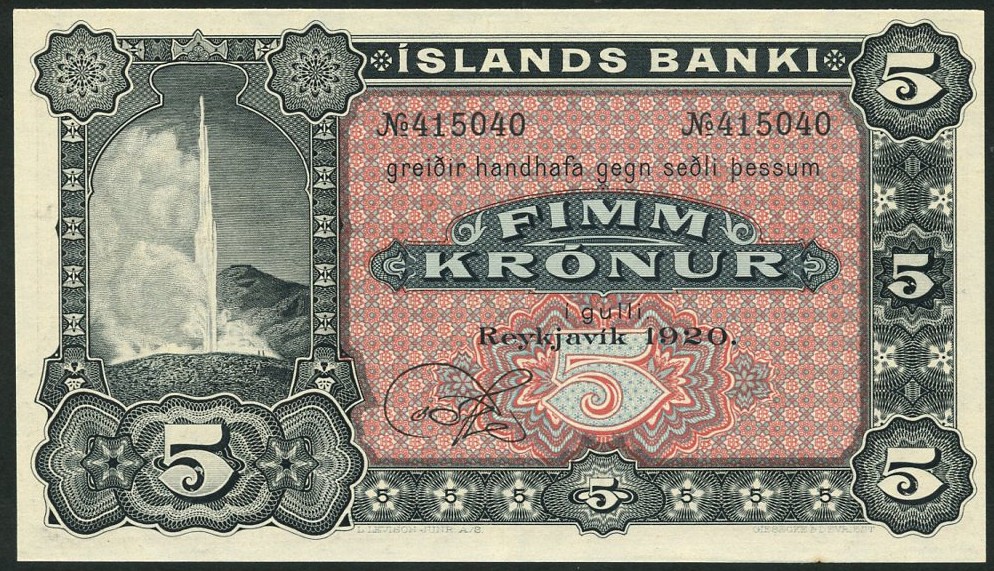 Islands Banki, remainder 5 kronur, 1920, serial number 415040, black on red and blue underprint, Geyser at left, reverse red and blue, Gyrfalcon at left