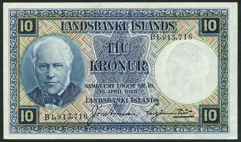 Landsbanki Islands, 5 kronur, 15 April 1928, serial number A2,373,225, brown on multicolour underprint, J. Eriksson at left, and 10 kronur, 15 April 1928, serial number B1,913716, blue on multicolour underprint, J. Sigurdsson at left