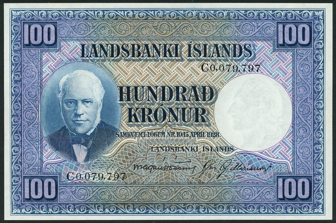 Landsbanki Islands, 5, 10, 50 and 100 kronur, L.1928 (1948-56), olive green, red, green and blue respectively, the 5 and 50 with J. Eriksson at left, the 10 and 100 with J. Sigurdsson at left